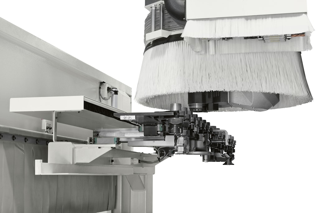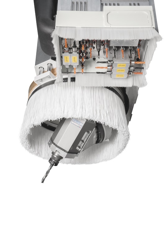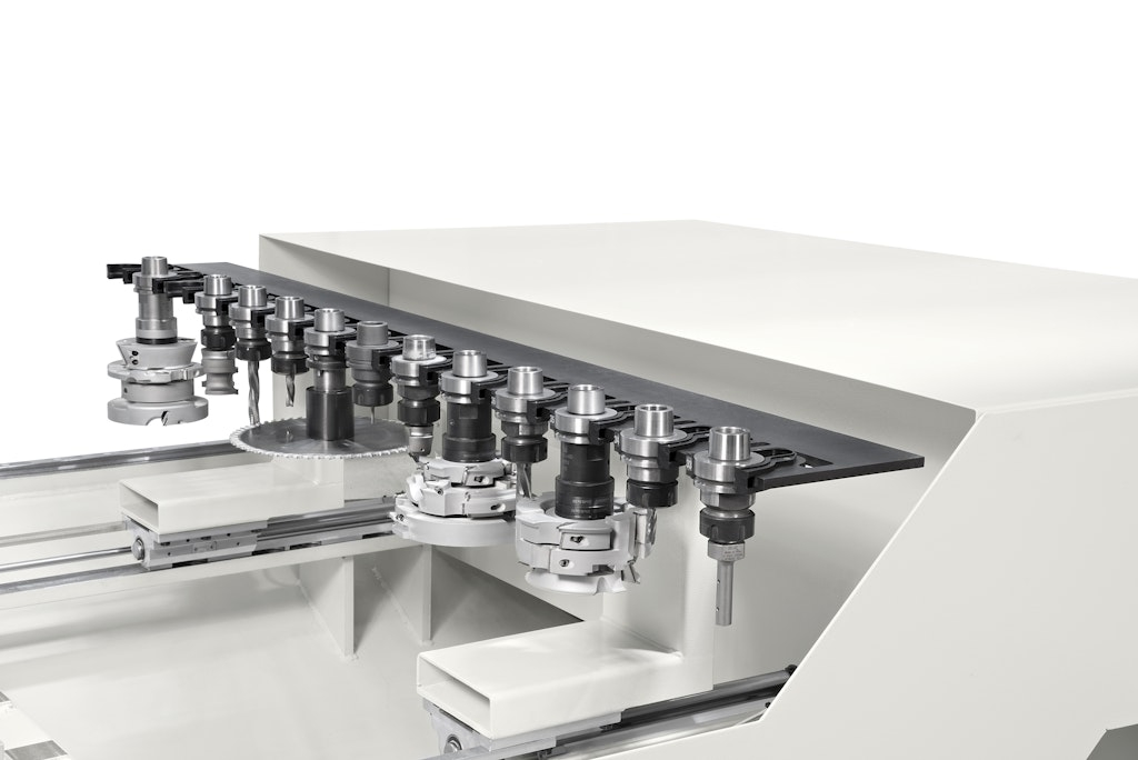 The unit can accommodate up to four machining units, including a device for inserting dowels using pearl glue.
